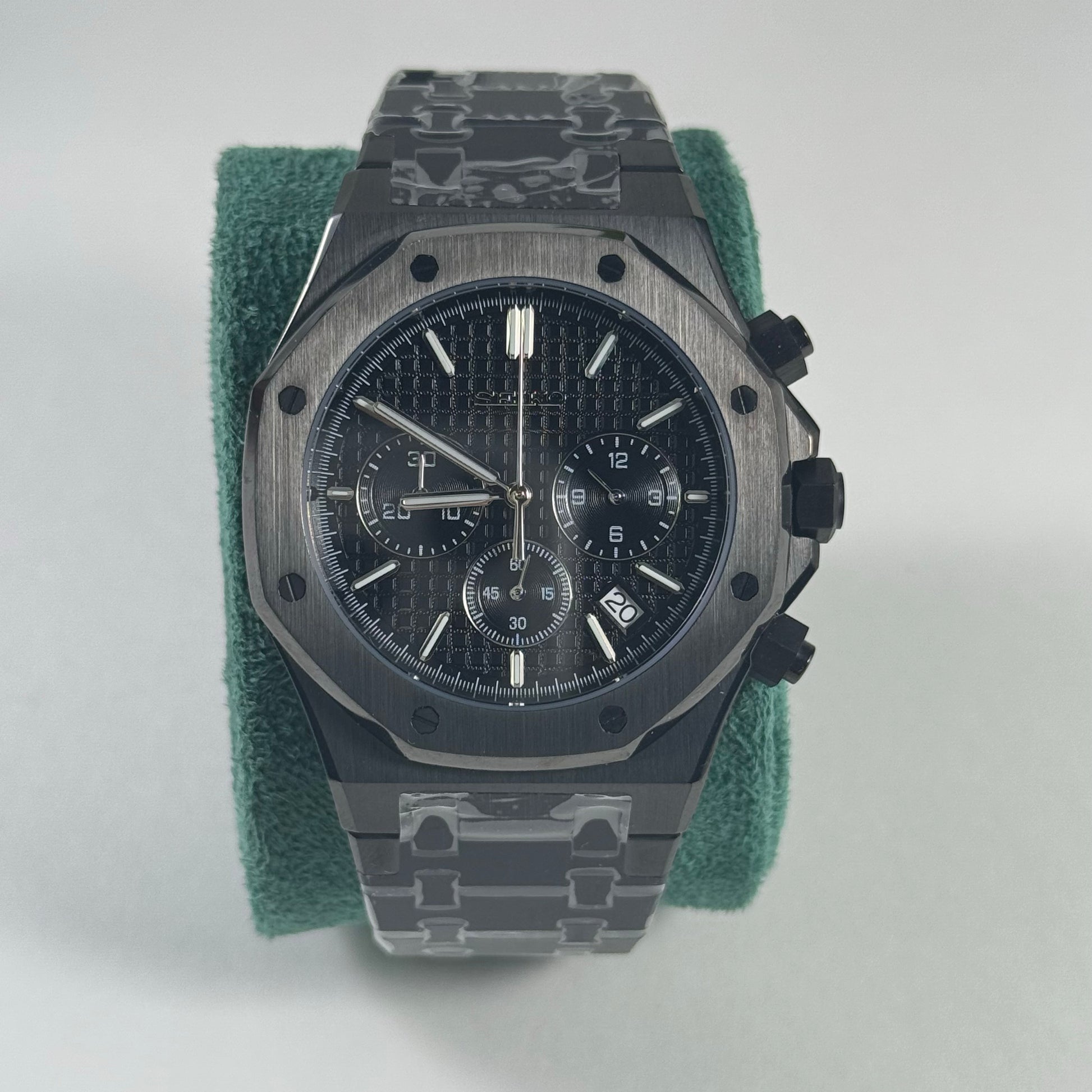 Introducing the Seiko Mod Royal Oak Chronograph Black Panther, a custom Seiko VK63 Quartz Mechanical Movement inspired by the iconic Royal Oak design, meticulously crafted for those who seek elegance and precision. This model features a Chronograph Black Panther aftermarket dial and a transparent back piece, allowing a glimpse into the intricate automatic movement.