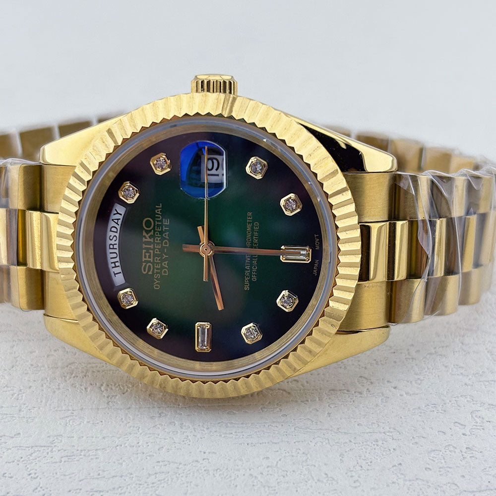 Discover the Seiko Mod Datejust Sunburst Gold a meticulously crafted NH35 Automatic Watch, inspired by the iconic Datejust design. This elegant timepiece features a grey sunburst aftermarket dial, encased in a 36 mm or 39 mm fluted bezel, offering a blend of style and precision for watch enthusiasts.
